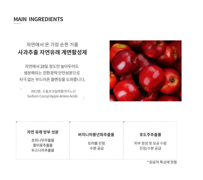 椰子及蘋果所提煉出的天然表面活性劑,不破壞肌膚本身油水平衡,5.9溫和弱酸性,採用低過敏成分,